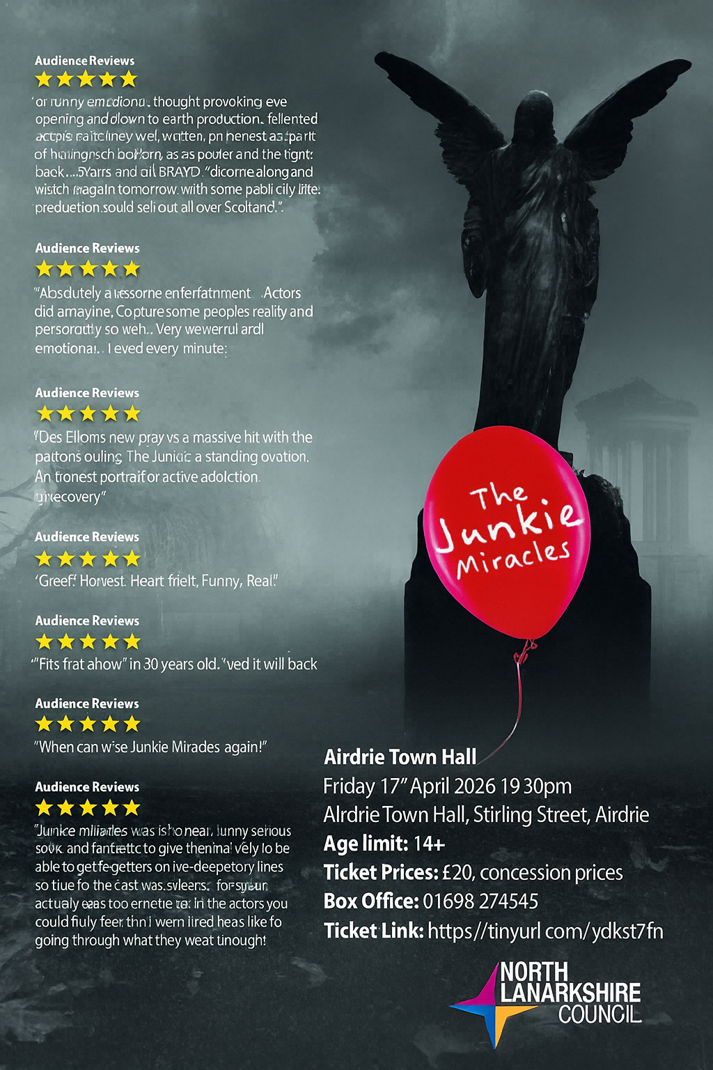 Our next production is called 'The Junkie Miracles' by Des Dillon. We are touring 4 theatres across Scotland in March/April 2026 'The Junkie Miracles' tells the intertwined and heart breaking stories of four addicts, tumbling into the abyss, and only four miracles can save them.